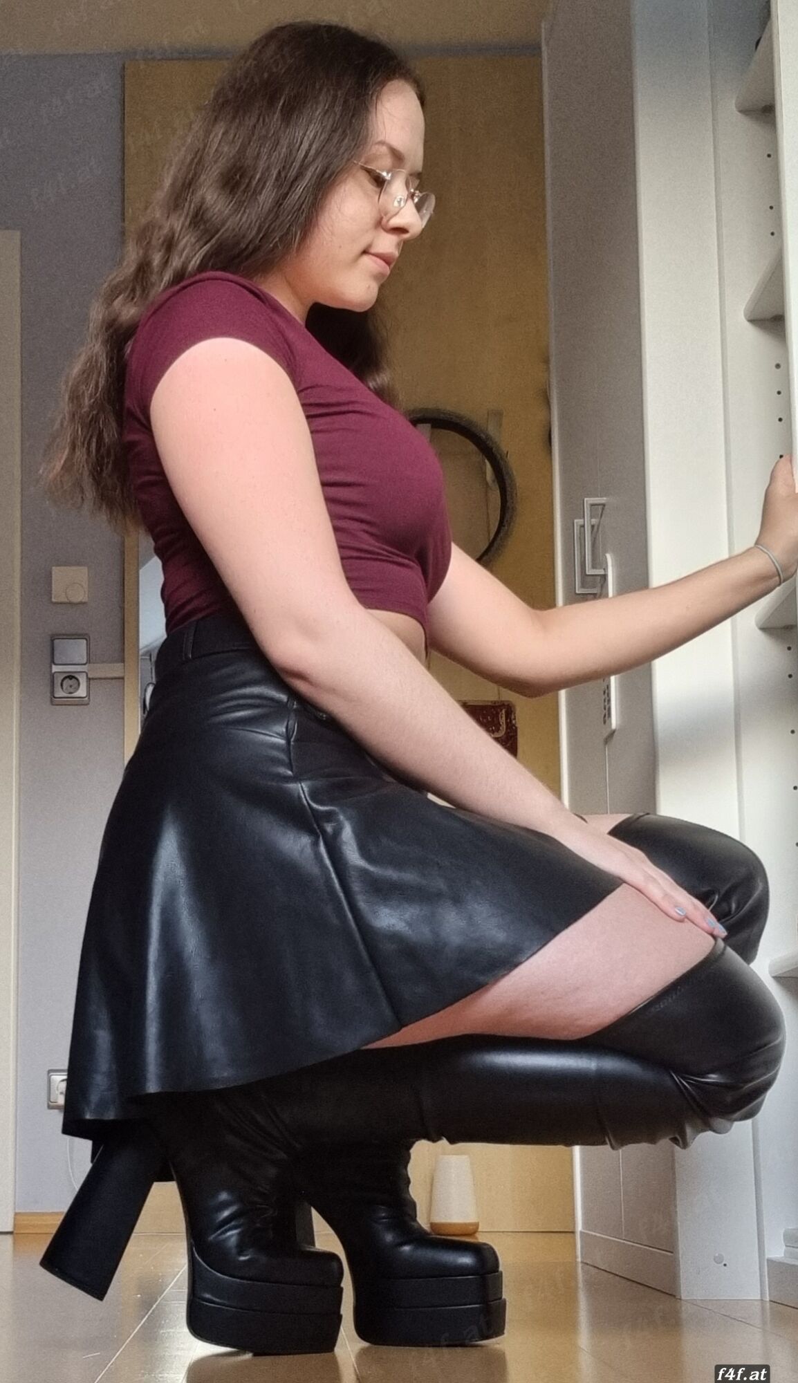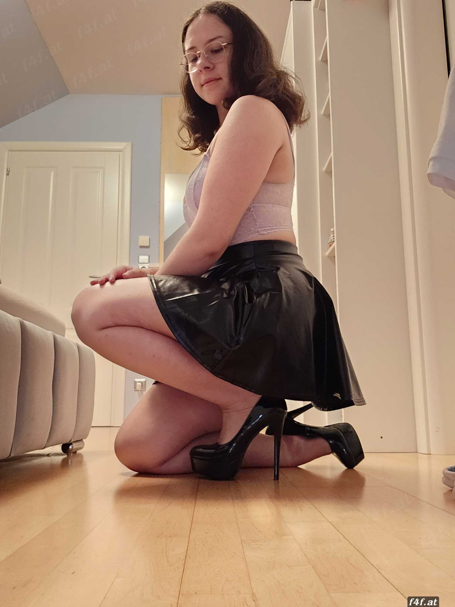 Ich (Domina) trage einen schwarzen Lederbody, eine schwarze Lederleggings von Slinkystylez und rote hohe High Heels🤤 in meinem Outfit setze ich mich auf das Gesicht von meinem Sklaven damit er mich brav leckt während er seinen Peniskäfig trägt👅😈